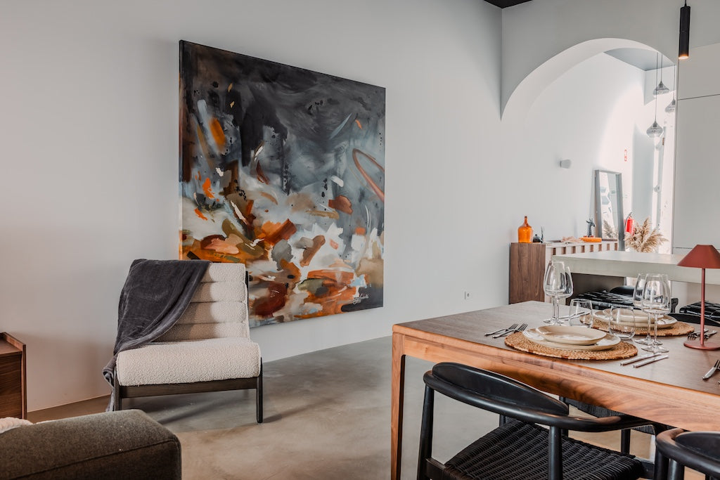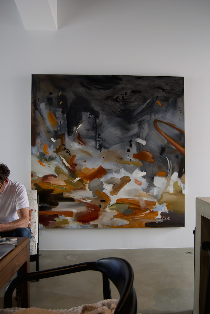 Inspired by the endless orange groves of the Algarve and that unmistakable moment when a glass of juice tips over — unexpected, vivid, alive — the painting doesn’t aim to represent, but to evoke. Swirls of citrus tones, splashes of gold, and layered textures come together in a dynamic composition that feels both free and intentional. The brushwork dances across the canvas like sunlight filtered through leaves, or juice spilling in slow motion — messy, beautiful, full of life. This piece infuses the space with brightness and bold personality — a visual pulse that never quite sits still.
